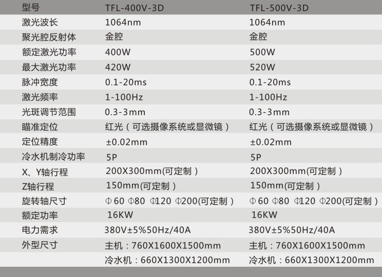 1、TFL-400V/500V-3D,由雙路氙燈泵浦、進口陶瓷反射腔體及Nd:YAG晶體棒構(gòu)成激光器,電光轉(zhuǎn)換效率高。